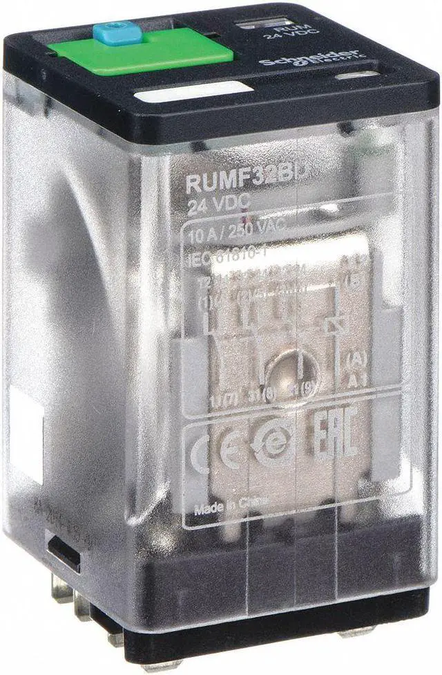 General Purpose Relay, Base Shape Square, Coil Voltage 24V DC, Contact Form 3PDT, Current Rating 10 A, Electrical Connection Quick-Connect, Flat Pin Width 0.189 in, Number of Pins 11, Pin Shape Flat, Sealing Enclosed, Status Indicator LED Indicator, Mechanical Flag, Contact Rating (AC) 10 A @ 250V, Contact Rating (DC) 10 A @ 28V, Horsepower @ 120V AC 1/3 hp, Horsepower @ 240V AC 1/2 hp, Mounting Style Plug-In, Push-To-Test Method Lockable, Body Depth 2.08 in, Body Height 1.39 in.