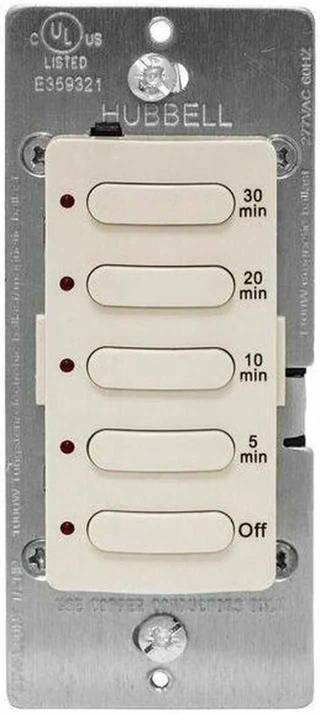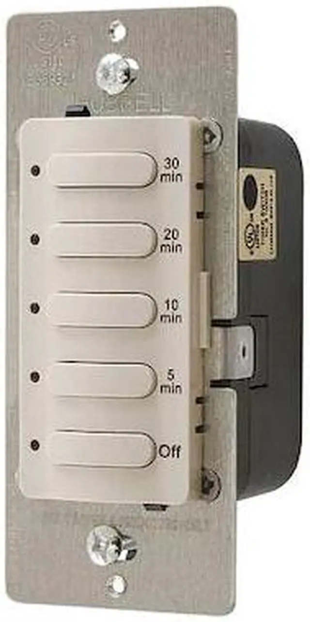 Countdown Timer, Min. Time Setting 5 min, Max. Time Setting 30 min, Voltage 120/277V AC, Watts 1000/1400, Amps 8.30, 1-Pole, HP @ 120V 1/6 hp, Type of Switch Electronic, Color Light Almond, Length 4 1/2 in, Width 2 in, Style Wall Switch, Depth 3 in, Number of Gangs 1, Features Manual Override, Pre-Set 5 Button Selection with Permanent Time Markings, Standards CEC Title 24, cULus UL60730-1, cULus UL60730-2, ASHRAE 90.1. This item has been restricted from sale in the following state (s): []