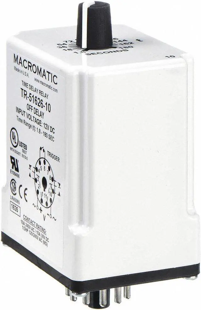 Single Function Time Delay Relay, Adjustment Method Potentiometer, Base Shape Octal, Coil Voltage 12V DC, Contact Form DPDT, Contact Rating (AC) 10 A @ 240V, Contact Rating (DC) 10 A @ 30V, Current Rating 10 A, Number of Delay Functions 1, Delay Function Off Delay, Electrical Connection Socket, Flat Pin Width Not Applicable, IP Rating IP20, Input Voltage 12V DC, Minimum Time Setting 1.8 sec, Maximum Time Setting 3 min, Number of Pins 11, Sealing Enclosed, Mounting Style Plug-In. This item has been restricted from sale in the following state (s): []