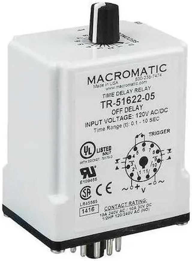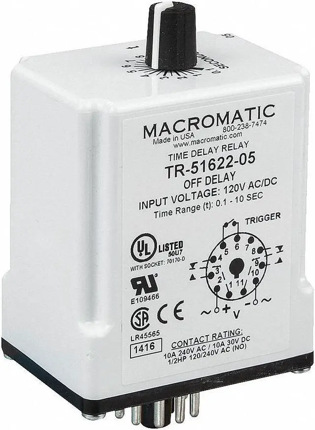 Single Function Time Delay Relay, Adjustment Method Potentiometer, Base Shape Octal, Coil Voltage 24V AC/DC, Contact Form DPDT, Contact Rating (AC) 10 A @ 240V, Contact Rating (DC) 10 A @ 30V, Current Rating 10 A, Number of Delay Functions 1, Delay Function Off Delay, Electrical Connection Socket, Flat Pin Width Not Applicable, IP Rating IP20, Input Voltage 24V AC/DC, Minimum Time Setting 1.8 sec, Maximum Time Setting 3 min, Number of Pins 11, Sealing Enclosed, Mounting Style Plug-In. This item has been restricted from sale in the following state (s): []