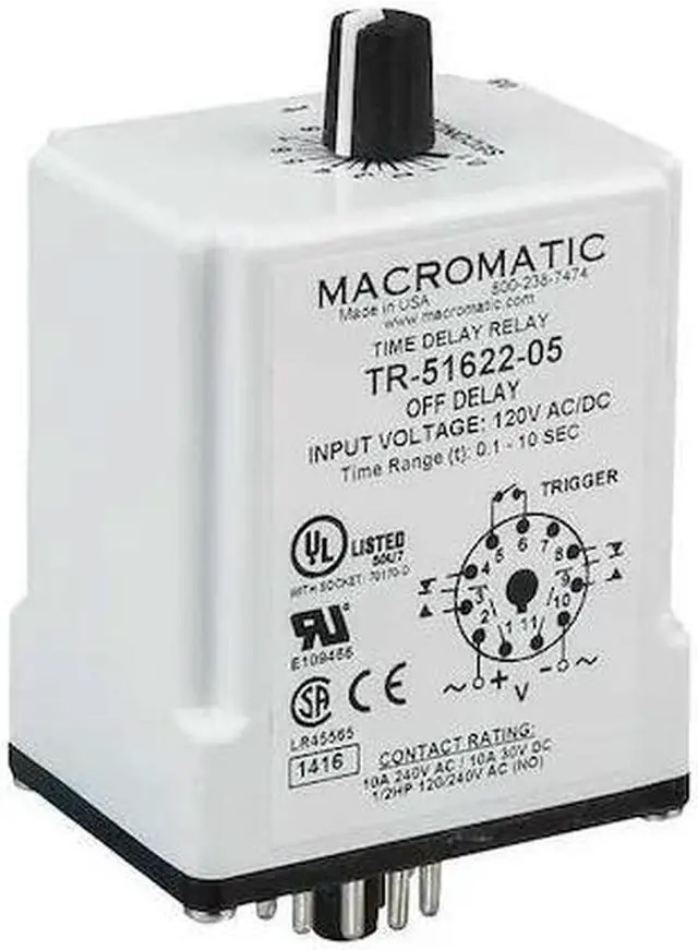 Single Function Time Delay Relay, Adjustment Method Potentiometer, Base Shape Octal, Coil Voltage 120V AC/DC, Contact Form DPDT, Contact Rating (AC) 10 A @ 120V, Contact Rating (DC) 10 A @ 30V, Current Rating 10 A, Number of Delay Functions 1, Delay Function Off Delay, Electrical Connection Socket, Flat Pin Width Not Applicable, IP Rating IP20, Input Voltage 120V AC/DC, Minimum Time Setting 0.6 sec, Maximum Time Setting 60 sec, Number of Pins 11, Sealing Enclosed, Mounting Style Plug-In. This item has been restricted from sale in the following state (s): []