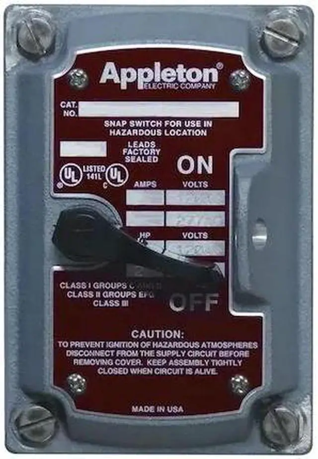 Motor Switch, Current AC 30 A, Hazardous Location Specification Class I, Div 1 and 2, Group C, D, Class II, Div 1 and 2, Group E, F, G, Class III, Div 1 and 2, Horsepower @ Single Phase - 120V AC 3 hp, Horsepower @ Three Phase - 240V AC 7 1/2 hp, Horsepower @ Three Phase - 480V AC 15 hp, Horsepower @ Three Phase - 600V AC 15 hp, Includes Pilot Light Yes, Number of Poles 3, Operator Handle, Phase Three, Starter Style NEMA, Terminal Connection Type Screw Terminals, Hub Diameter 0.75 in.