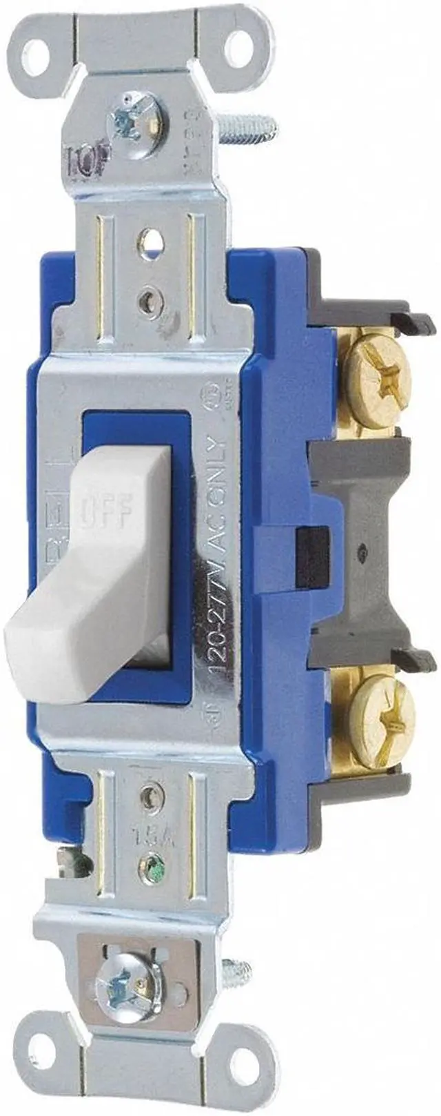 Wall Switch, Color White, Current Rating 15 A, Switch Function Maintained, Switch Type Single Pole, Voltage Rating 120/277V AC, Wiring Method Back, Side, Horsepower Rating 2 hp, Locking Style Not Applicable, Number of Switches 1, Standards UL/CSA/NOM, Switch Style Toggle, Wire Connection Type Screw Terminals, Market Industrial, Overall Height 1.7 in. This item has been restricted from sale in the following state (s): []