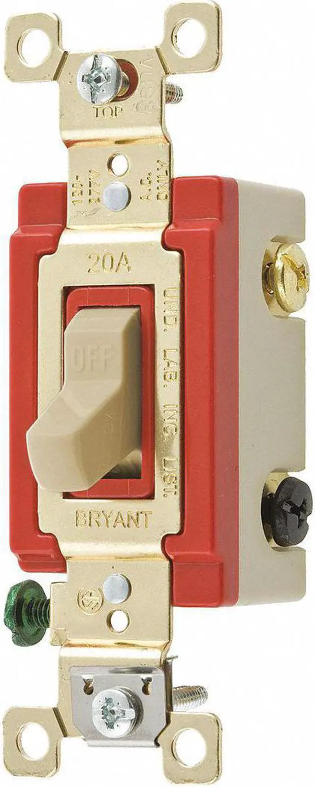 Wall Switch, Color Ivory, Current Rating 20 A, Switch Function Maintained, Switch Type 3-Way, Voltage Rating 120/277V AC, Wiring Method Back, Side, Horsepower Rating 2 hp, Locking Style Not Applicable, Number of Switches 1, Standards UL/CSA, Switch Style Toggle, Wire Connection Type Screw Terminals, Features Brass and Nickel Plated Steel Ground Terminal, Market Industrial, Overall Height 1.7 in. This item has been restricted from sale in the following state (s): []