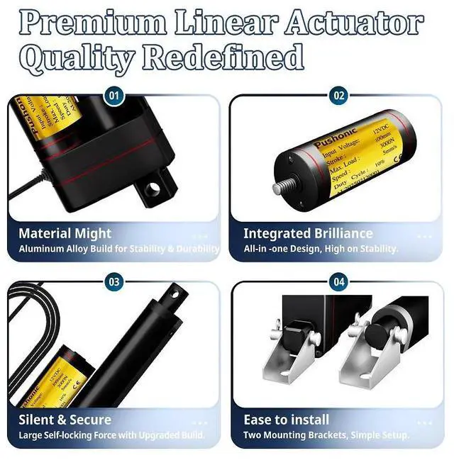 - Low Noise & Durable Build: Constructed from aluminum alloy with waterproof and dust-proof housing,this upgraded electric linear actuator has High-quality plastic worm gears keep noise under 50dB. Offers stronger self-locking and longer life than other bear linear actuator models