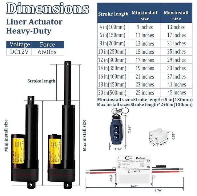 - Heavy Duty Performance: This 660 lbs 12V electric linear actuator offers higher thrust than low-force models,matches the cheap linear actuators but comes with remote control kits included. With a 4" (100mm) stroke,0.19/s speed, it delivers strong push force with reliable performance. The integrated base ensures stability, and the built-in limit switch provides accurate positioning