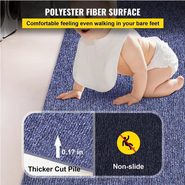 Color: Blue Product Length: 49.2 ft Product Width: 6 ft Material: Polyester Fiber + TPR Carpet Thickness: 0.18" / 4.6 mm Pile Height: 0.17" / 4.5 mm