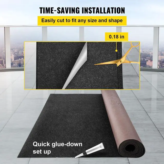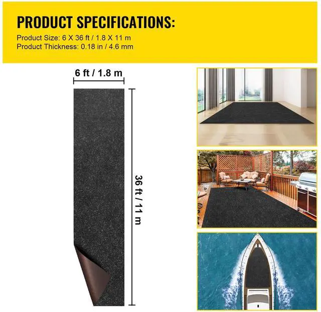 Premium Marine Carpet: Color: Charcoal Black; Size: 5.9 x 36 ft(1.8 x 11 m); Carpet Thickness: 0.18 in(4.6 mm). Our high-quality marine carpet is made of polyester fiber, featuring a vapor-proof and non-deformed performance. Long-time use can save your costs. Besides, the black color makes it quite modern.