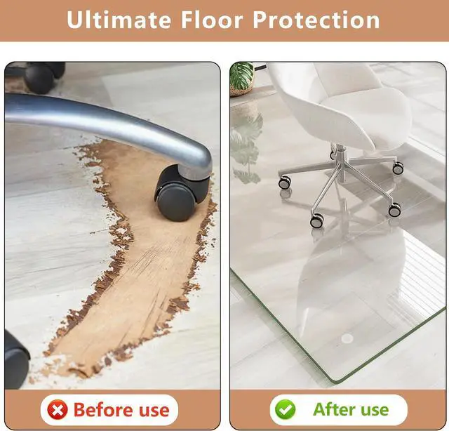 Upgrade to a Longer-Lasting, Healthier Glass Mat Tired of noisy PVC mats that slip, curl, tear, and have a short lifespan? Upgrade to our premium tempered glass mat! Crafted as a single, seamless piece, it features a crystal-clear, ultra-smooth surface that eliminates noise and resistance for effortless chair movement. This durable alternative protects your floors while creating a quieter, higher-quality workspace.