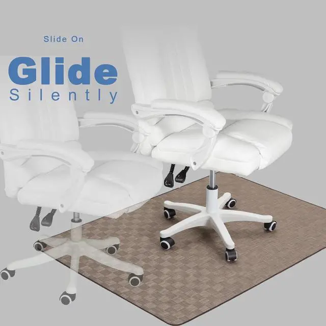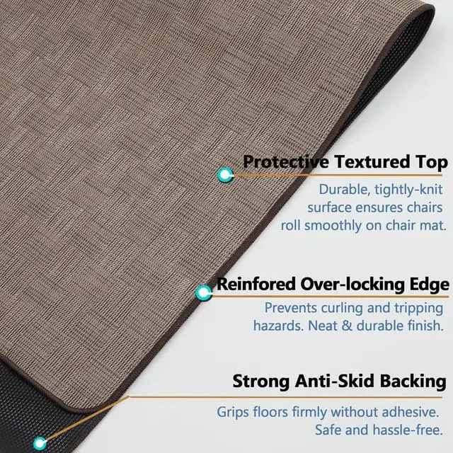 [Non-slip bottom & Effortless roll] The front side of our office chair mat allows you to roll your chair but won' t feel slippery. The bottom side can grab the ground very well and stays in place so it wont slide. The over-locking edge can let you slide the chair onto the mat smoothly.