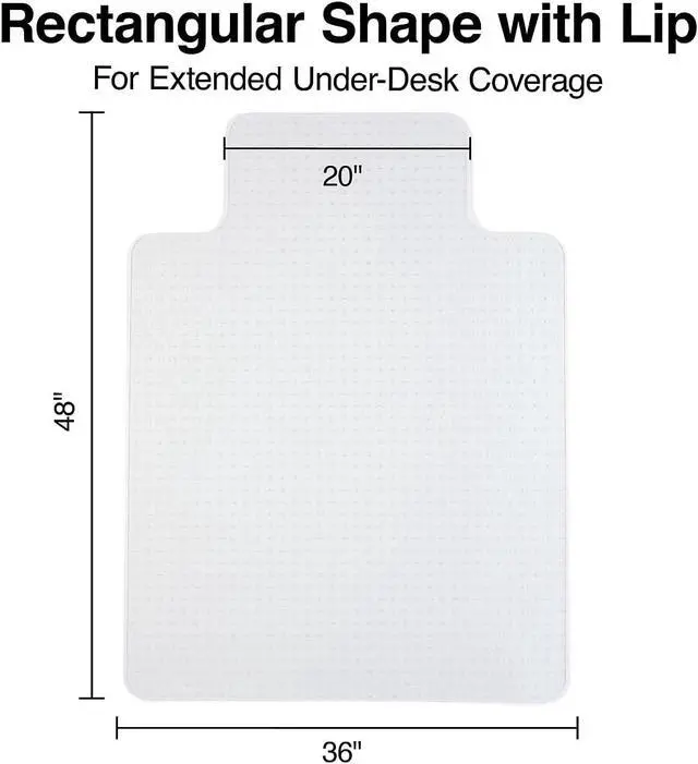 CHAIR MAT FOR CARPET: Designed to stay in place and keep your carpets looking like new, our desk chair mats provide a lip shape for extended coverage under your desk Mat measures 48 x 36 inches, with the lip measuring 20 inches (Sold as 1 Each)