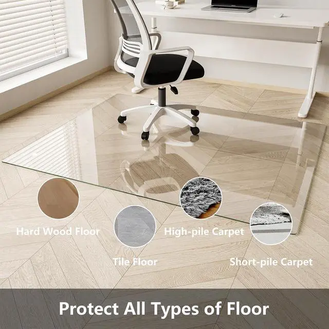 Full-On Style: Say goodbye to bulky, eyesore chair mats. This glass chair mats for carpeted floors is 100% crystal-clear, designed to disappear under your chair while letting your floors steal the show. Whether youre decking out a sleek downtown office, a cozy home study, or a modern living space, it blends in seamlesslylike a protective shield that doesnt cramp your style.