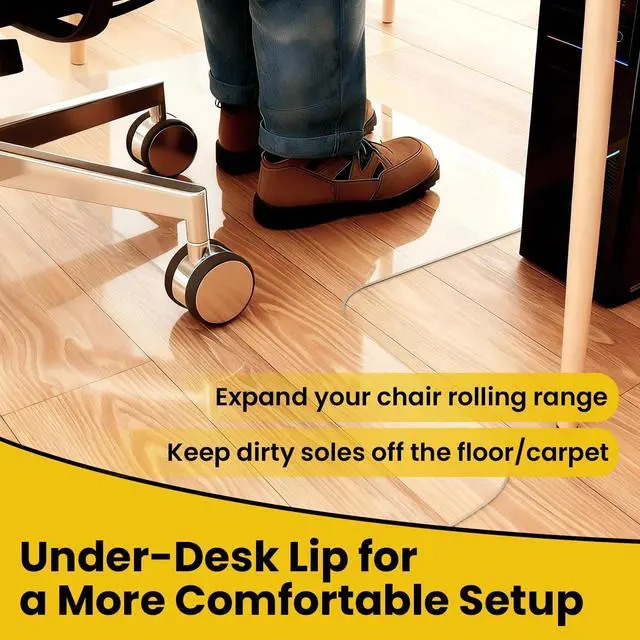 Extended Lip Design for Compact Desks- The specialized Extended Lip shape fits perfectly between desk legs, offering extra coverage where your feet rest. This design maximizes floor protection under the desk while optimizing usable space in smaller home offices or cubicles.