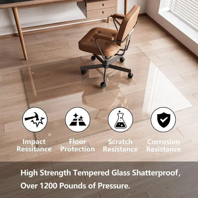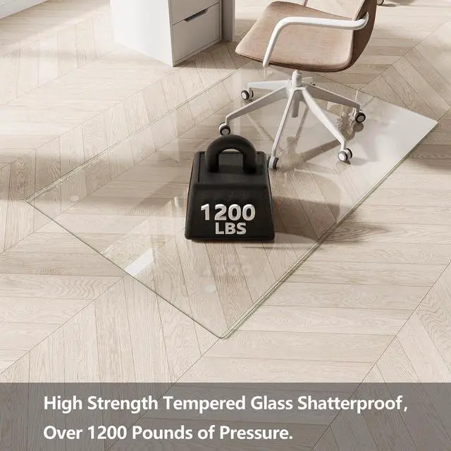 Last: Crafted from premium tempered glass, this glass chair mat stands up to over 1, 200 lbs of weightno sweat. Unlike cheaper materials, office chair mat wont crack, curl, shatter, scuff, or fade over time. Think of it as the last chair mat for carpet youll ever needbuilt to outperform, outlast, and keep your space looking sharp, day in and day out.