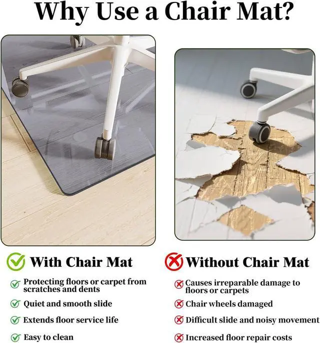 • Durable Glass Office Chair Mat: Effectively helps to prevent damage to hard floor caused by your office chair casters or wheels. The full transparent glass floor chair mat allows the beauty of your floor can be clearly seen. It will not obstruct the pattern on the floor and add a bright luster to the floor. In addition smooth surface, easy to clean food residue, best choice for home workplace and offices.