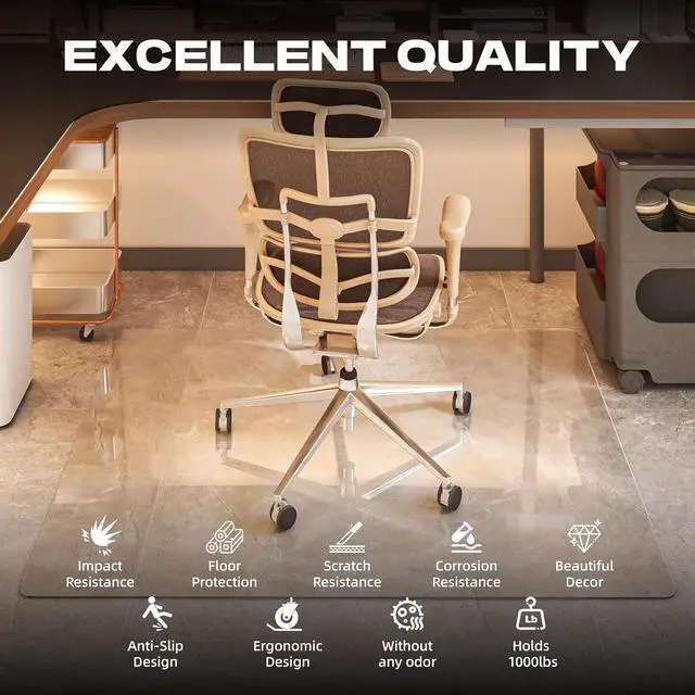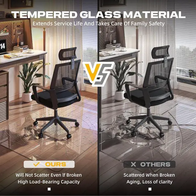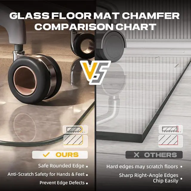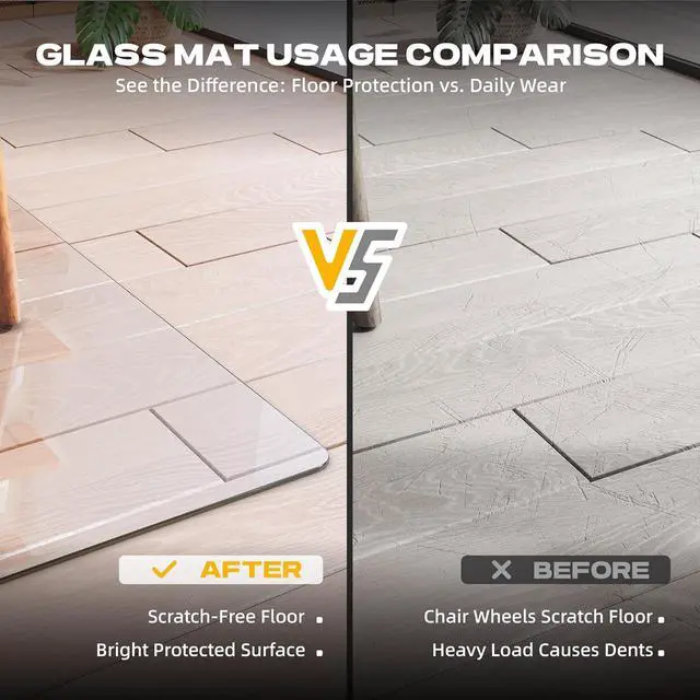 EAST TO CLEAN: The fully transparent glass office chair mat is very clear, allowing the floor or mat to be seen at a glance. The smooth surface makes it easy to clean food residue, making it a great choice for dining tables, offices and children' s scribble rooms. The glass floor mat with beveled edges is made of tempered glass and won' t yellow with long-term use
