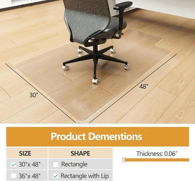 30X48 DESK CHAIR MAT: Measuring 30" L x 48" W x 0.06 " Th, this rectangle 30x48 chair mat with lip is suitable for office, restaurant, living room and school uses, providing reliable protection and stability