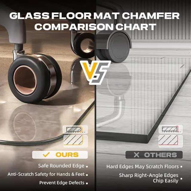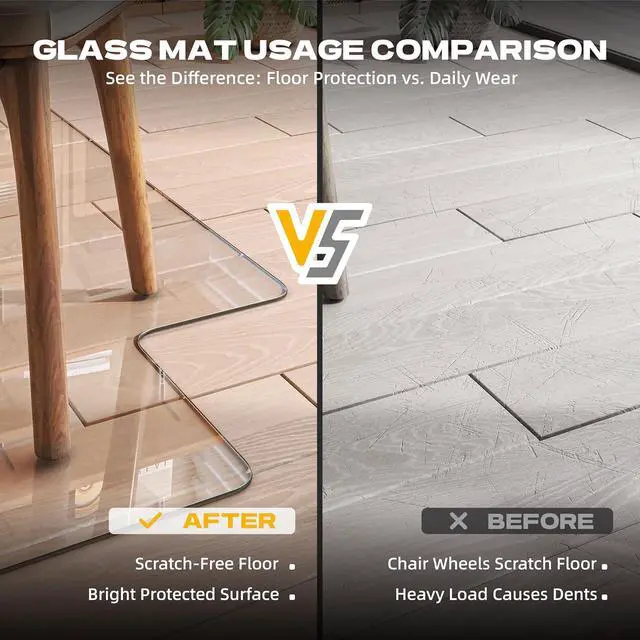 EAST TO CLEAN: The fully transparent glass office chair mat is very clear, allowing the floor or mat to be seen at a glance. The smooth surface makes it easy to clean food residue, making it a great choice for dining tables, offices and children' s scribble rooms. The glass floor mat with beveled edges is made of tempered glass and won' t yellow with long-term use