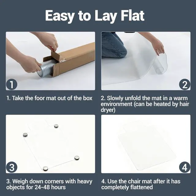 Roll-Up Packaging NoteThe desk chair mat ships rolled for convenience. Lay it flat and place weight on the edges to help it return to its original shape.