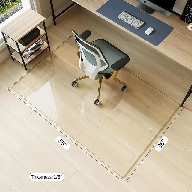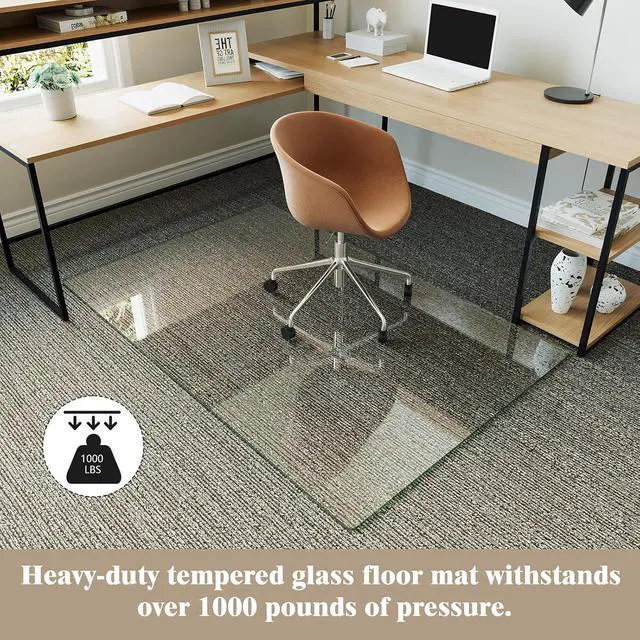 TEMPERED GLASS OFFICE CHAIR MAT: Crafted from explosion-proof and shatter-proof tempered glass ( 0.19 " thickness), our chair mat delivers exceptional durability with scratch-resistant, pressure-resistant (1000+ lbs capacity), and anti-deformation properties. Effectively protects hardwood floors, tiles, laminate flooring, and carpets from chair wheel marks and permanent indentations. Outlasts traditional plastic/PVC mats by decades, significantly reducing replacement costs.