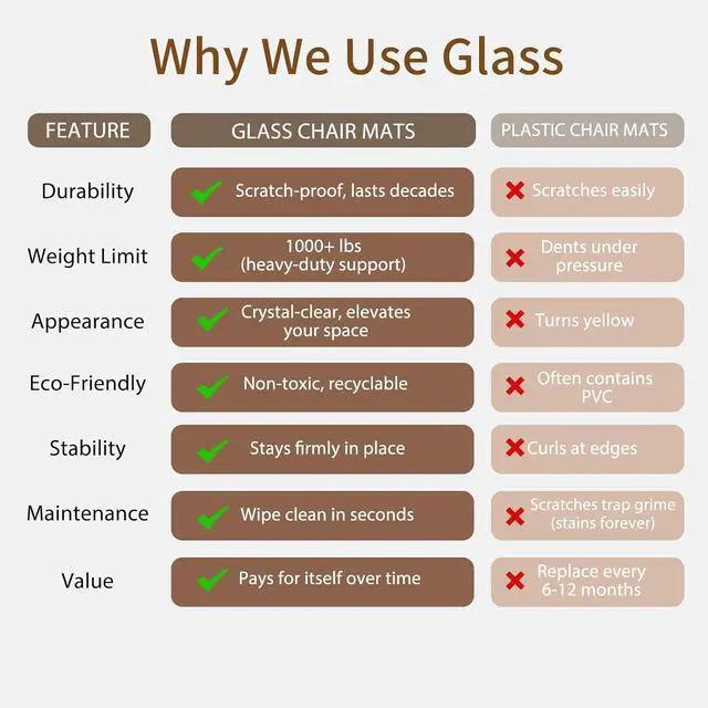 Crystal-Clear Transparency for Floor VisibilityThe high-transparency glass allows your carpets design or hardwoods grain to show through naturally. It provides ample coverage for workspace mobility while blending seamlessly into your décor. No more cloudy or yellowed mats obscuring your floors.