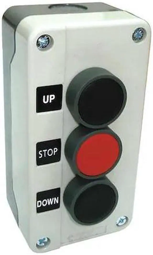 California Proposition 65: This product contains a chemical known to the State of California to cause birth defects or other reproductive harm. Control Station, Number of Operators 3, Number of Pilot Lights 0, Size 22 mm, Legend Up/Stop/Down, Type of Operator Push Button/Push Button/Push Button, Action Momentary/Momentary/Momentary, Operator Color Black, Red, Contact Form 2NO/1NC, Mechanical Interlock No, NEMA Rating 4, 4X, Contact Rating 10A @ 600V AC, 2.5A @ 24V DC, NEMA Contact Rating Designation A600/Q600, Mounting Wall, Height 1.98 in, Width 5.27 in, Depth 2.69 in, Head Material Plastic, Enclosure Material Thermoplastic. This item has been restricted from sale in the following state (s): []