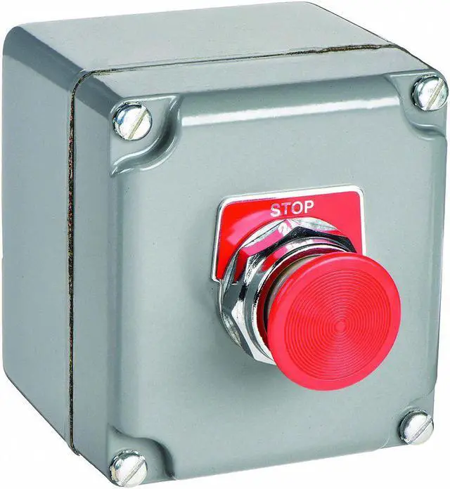 Control Station, Number of Operators 1, Number of Pilot Lights 0, Size 30 mm, Legend Stop, Type of Operator Push Button with Mushroom Head, Action Momentary, Operator Color Red, Contact Form 1NO/1NC, Mechanical Interlock No, NEMA Rating 1, 13, 3, 4, Contact Rating 10A @ 600V AC, 2.5A @ 24V DC, NEMA Contact Rating Designation A600/Q600, IP Rating IP66, Mounting Wall, Hub 3/4 in NPT, Height 3.53 in, Width 3.58 in, Depth 4 in, Enclosure Material Zinc, Enclosure Color Gray.
