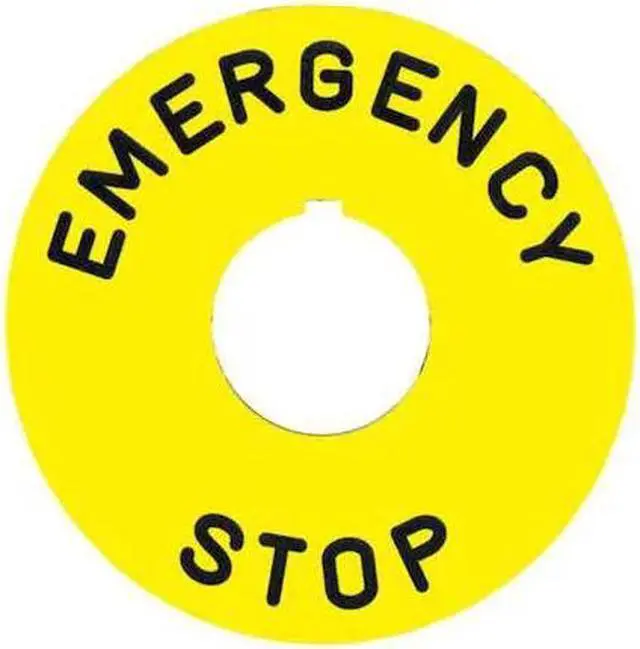 Legend Plate, Round, Legend Emergency Stop, For Use With 30mm Mushroom Heads, Legend/Background Color Yellow, Material Plastic, Width 1.9 in, Diameter 60 mm. This item has been restricted from sale in the following state (s): []