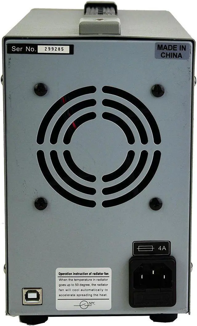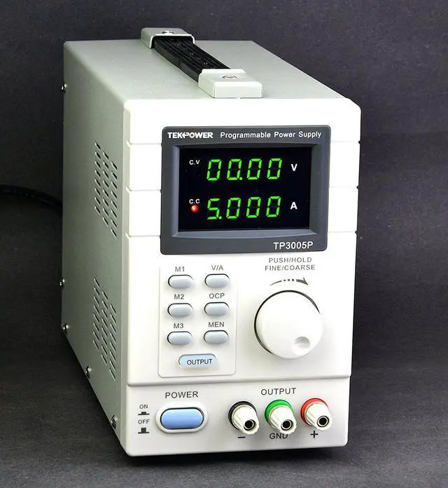 Single-output programmable variable DC regulated power supply with dual LED displays adjusts continuously from 0 - 30 volts and 0 - 5 amps with both coarse and fine adjustment, 10 mA / 1 mV resolution over the full range