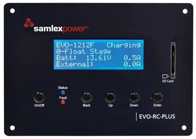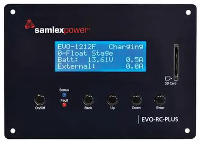 Programmable Remote Control for Evolution™ F Series Inverter/Charger - OptionalRemote Control for EVOTM F Series Inverter/ChargersThe EVO-RC-PLUS is intelligent remote control designed specifically for use with Samlex EvolutionTM F Series of Inverter/Chargers.View real-time activity on the alpha numeric LDC display with 4 rows of 20 character while the unit is operating: Output voltage, Frequency, Amps, Watts, Volt Amps, Power Factor, Battery Voltage, Battery Current, Solar Input Current and more.For use with: EVO-1212FEVO-1212F-HWEVO-1224FEVO-1224F-HWFeatures:Advanced features for programming various parameters and modes of operation4 rows of 20 characters alpha numeric LCD display for messagingRobust metal enclosureSD card slot can manage a removable SD Card up to 16GB (SD Card not included)Includes 10M/33ft data cableApplications:Boats, RVs, trucks, specialty vehiclesAlternative energy, off-grid, cabins, remote locations, areas with unreliable utility powerBack-up and emergency power applicationsWARNING: This product can expose you to chemicals which are known to the State of California to cause cancer, birth defects or other reproductive harm. For more information go to P65Warnings.ca.gov.