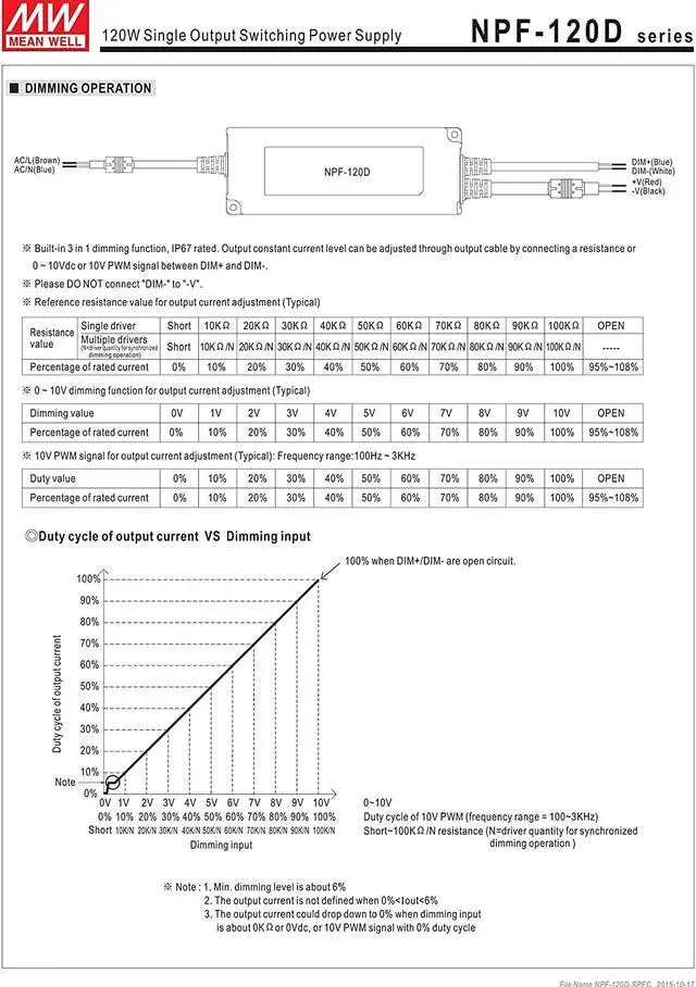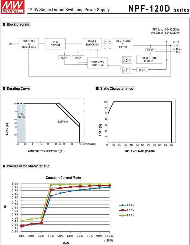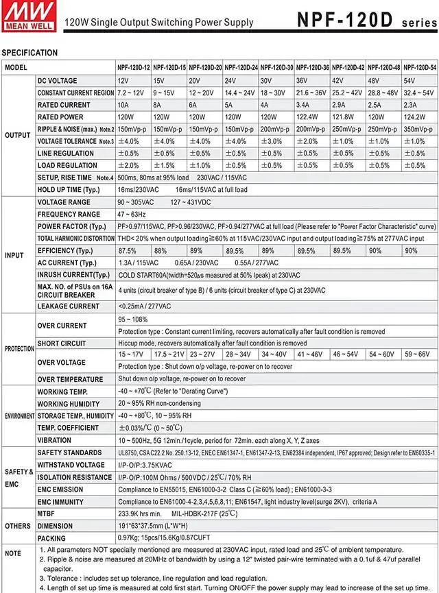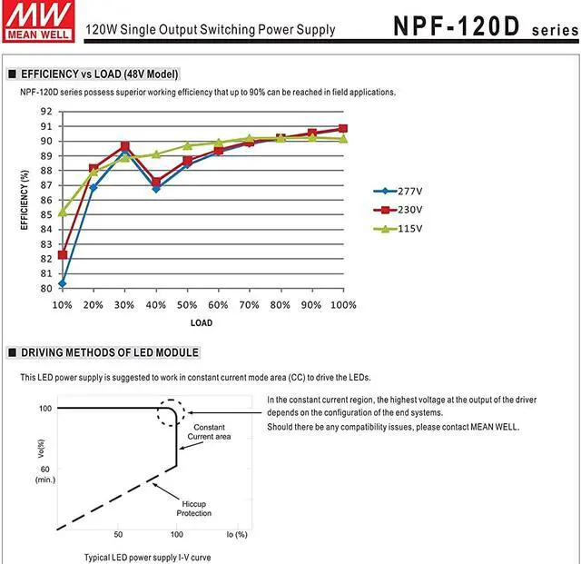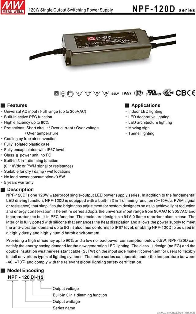 The NPF-D series from Mean Well is a AC/DC LED driver that features a constant current mode output with dimming. It is designed to operate from 90~305Vac and offers a variety of output currents, selected by a range of voltages from 12V to 54V. These LED power supplies are efficient up to 90% and thus don't require anything more than free air convection for cooling. The shape is similar to a standard ballast or 'butterstick style', it includes mounting holes for securing down and is IP67 rated for dry, damp or wet locations. To control the output, the NPF features 3 in 1 dimming: 0~10V, 10V PWM, or resistance. This flexibility provides a great feature when designing lighting systems and with a 5-year warranty, gives the end-user a reliable product for driving LEDs.