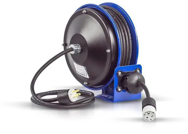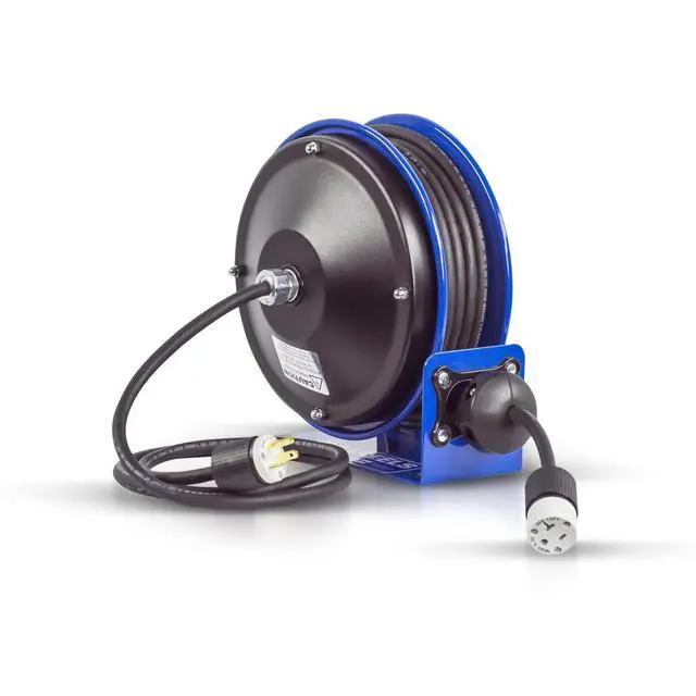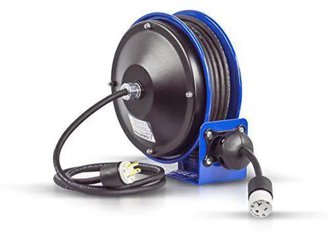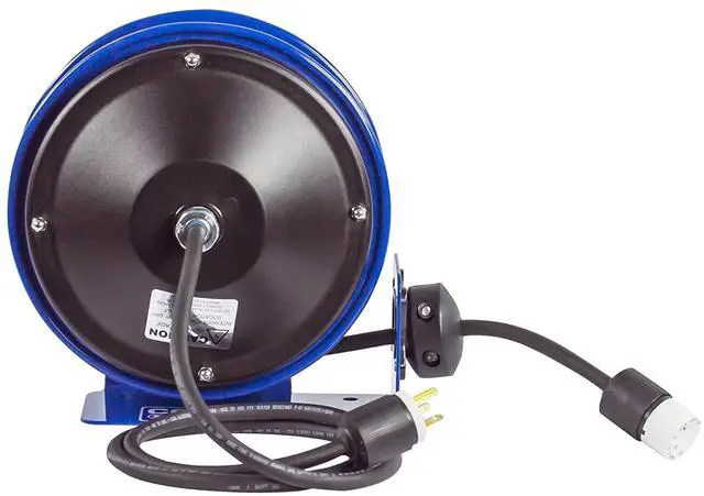 The Coxreels PC10 compact spring-driven power cord reel is an ideal cord management solution for commercial or industrial applications where space is limited. Auto rewind wraps, stores and maintains electrical cord around heavy-duty steel reel. Equipped with a continuous radius grommet-style power cord guide and a C-PEP composite hub for high chemical resistance and extra strength at cold temperatures. U.S.A. Swivels: No, Automatic Rewind: Yes, spring-driven, Length (ft.): 30, Color: Blue, UL Listed: Yes, Outlets (qty.): 1, Lead-in Cord Length (ft.): 5, Mount Type: Floor, wall, truck, under counter, Amps: 20, Plug Type: NEMA 5-15, Cord Size: 12/3