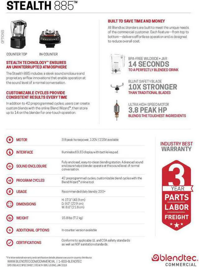 The Stealth 885 combines durability, power, and a wealth of exciting features including a tactile touch pad. Simply put, it's the quietest, most advanced, and easiest to use commercial blender on the planet. The Stealth 885 includes a sleek sound enclosure, proprietary sound dampening and airflow innovations. These features allow it to operate at a sound level comparable to a normal conversation without compromising the power Blendtecis famous for, proving you can still have industrial strength power without industrial strength noise. The Stealth 885 comes equipped with 42 preprogrammed cycles and a USB port. For the ultimate in customization, users can create custom drink programs with the online BlendWizard. This tool can create an unlimited number of blend cycles, and up to 14 can be stored on the blender. The Stealth 885s cutting-edge design and functionality deliver an advanced yet user-friendly blending experience. Features include: Motor: 3.8 peak horsepower, 1875 watts, 15 amps, Program cycles: 42 preprogrammed cycles, Pulse, Manual Speed, 3-year warranty. Standard package includes: Stealth 885 motor base, Sound enclosure, 2 BPA-free, FourSide jars with black soft lid.