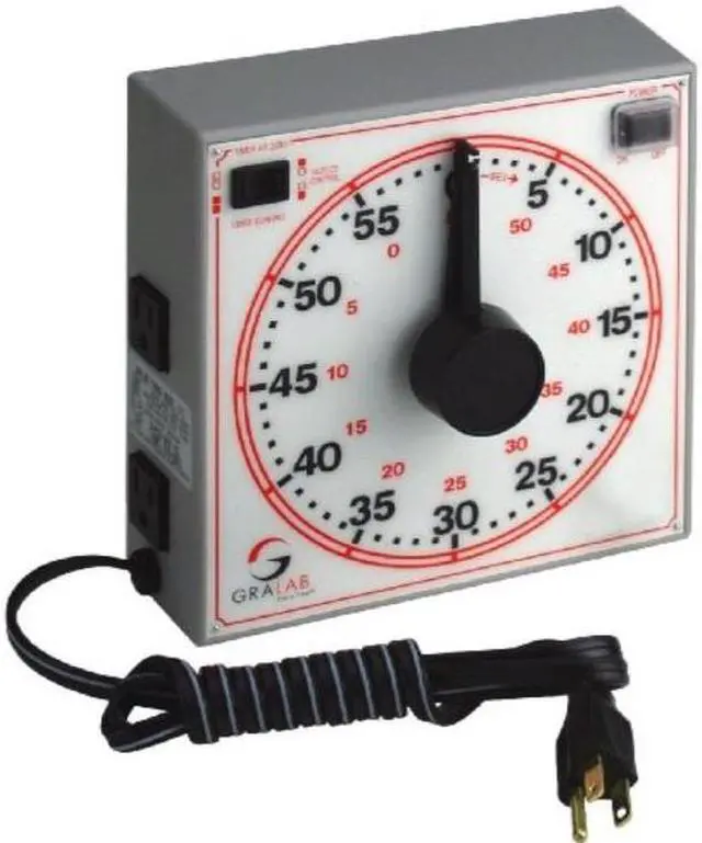 GraLab Model 171 general purpose 60-minute timer has a 6 inch face (diameter), with two numbered rings; one for tracking elapsed time, and one for stop watch use; two hands for setting by minutes and seconds, and two outlets for automatic switching between external devices. The electric motor provides + or - .015% accuracy. The timer has a nonconductive plastic case and rubber base pads to help protect against impact, chemicals, moisture, and electrical shock, with a recessed handle for easy gripping, and keyholes for wall mounting. The timer has an automatic alarm with adjustable volume. Electromechanical timers are commonly used in laboratory, darkroom, restaurant, manufacturing, and sporting event settings. The GraLab Model 171 timer has a 6.5 face (Diameter), measures 7.5 x 7.5 x 2.5 inches (H x W x D), and weighs 3.0 lb. (H is height, the vertical distance from lowest to highest point; W is width, the horizontal distance from left to right; D is depth, the horizontal distance from front to back.) The Model 171 has a limited one-year warranty. GraLab manufactures electromechanical timers. The company is headquartered in Centerville, OH, and meets International Organization for Standardization (ISO) 9001:2000 standards.