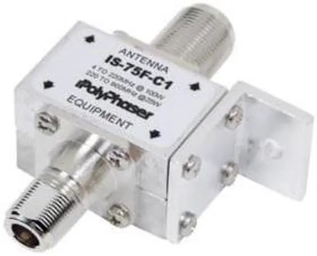 Polyphaser IS-75F-C1 flange mounted channel 2 through 83 CATV/MATV protector for 4 MHz to 900 MHz with F- Female connectors on both sides. It is designed to protect against lightning events for HF, UHF and VHF radios.