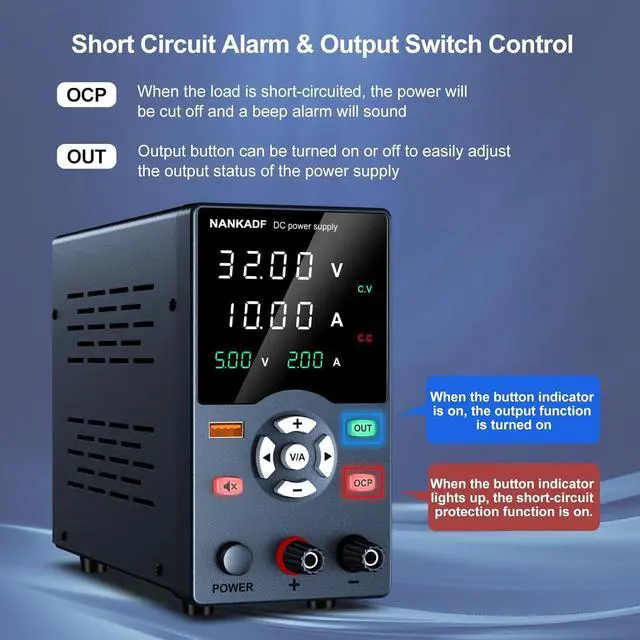 When a short circuit occurs in the adjustable dc power supply or load, the variable power supply will automatically stop output and sound an alarm.