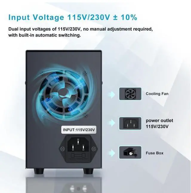 This upgraded dc power supply automatically switches input voltage based on your location. If you are in a region using 110V, it will adjust to 115V.