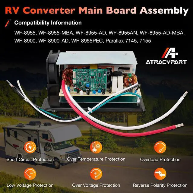 Our WF-8955-AD-MBA RV converter is designed for efficient power conversion, reliable battery charging, and seamless installation. Whether you need a WF-8955 55 Amp Power Converter, a WF-8955-MBA Main Board Assembly, or an RV converter replacement, this unit ensures smooth operation for your RVs electrical system.