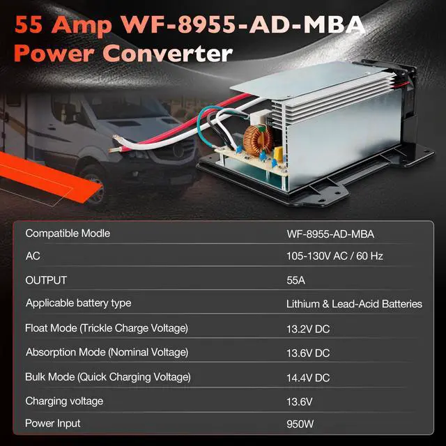 Upgrade your RVs power system with our WF-8955 55 Amp converter for smooth, efficient, and safe performance on the road!