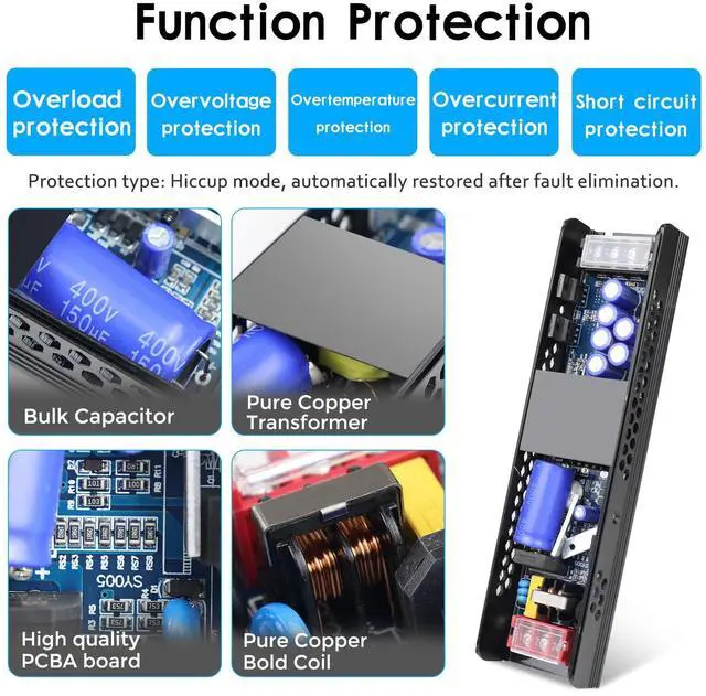 24 volt power supply has multiple layers of built-in protection, so you can use it safely. Overload, overvoltage, overheating, overcurrent, short circuit, leakage and other protection