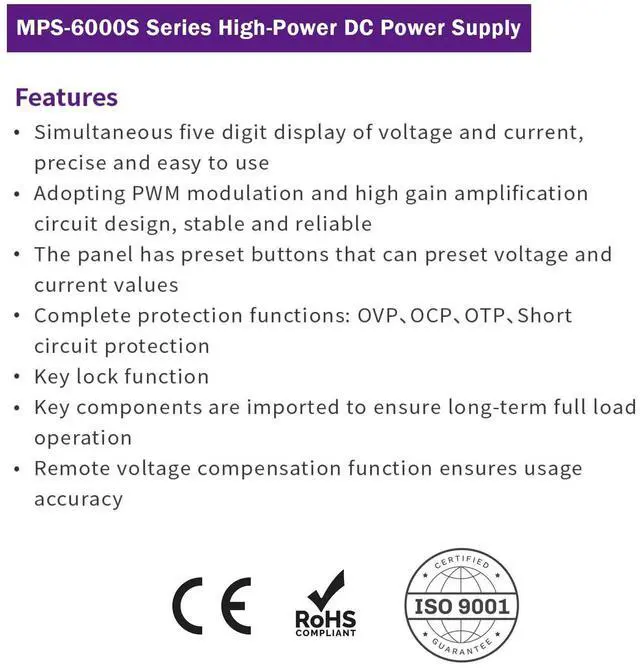 | Features | adjustable bench dc power supply 6000w variable lab dc power supply switching dc power supply, MATRIX MPS-6000S-1000-6 High Voltage Programmable DC Power Supply 1000V 6A 6KW High-Power with OVP, OCP, OTP, Short Circuit Protection, Input AC 220V 50Hz |