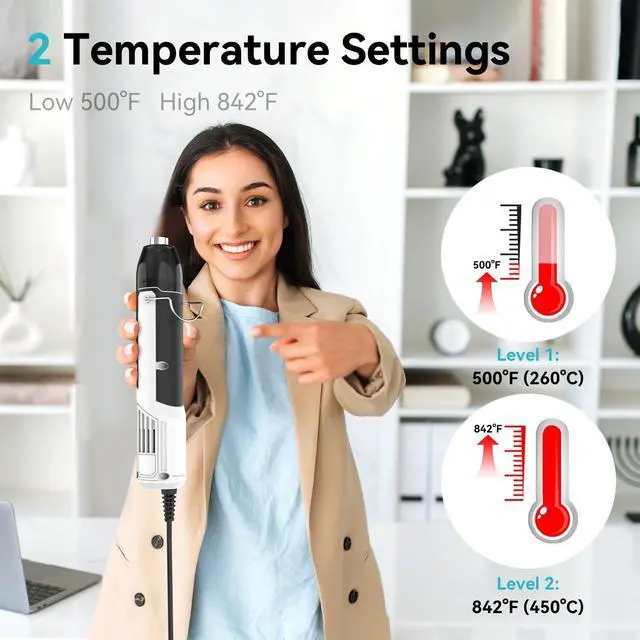 Powerful Performance: 350W mini heat gun with dual temperature settings (500 & 842 / 260 & 450) for precise heating tailored to your needs
