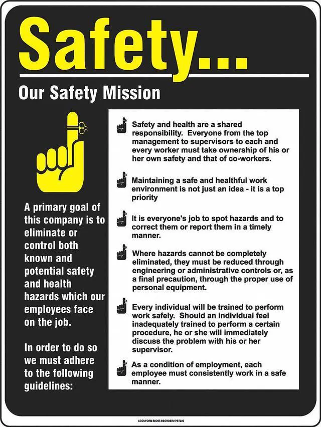Safety Poster, Shape Vertical Rectangle, Safety Banner Legend Safety... Our Safety Mission, Sign Legend Style Symbol and Text, Printed Language English, Background Color Black, Number of Printed Sides 1, Width 17 in, Height 22 in, Thickness 0.024 in. This item has been restricted from sale in the following state (s): []