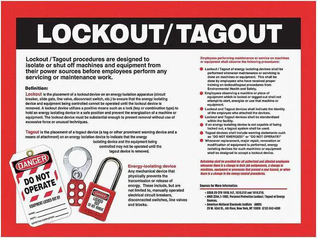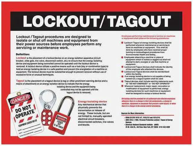 Safety Poster, Shape Horizontal Rectangle, Safety Banner Legend Lockout Tagout, Sign Legend Style Symbol and Text, Printed Language English, Background Color White, Number of Printed Sides 1, Width 22 in, Height 17 in, Thickness 0.024 in. This item has been restricted from sale in the following state (s): []