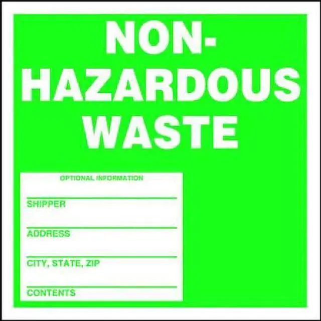 DOT Handling Label, Language English, Handling Label/Placard Type Waste, DOT/UN Product Form Label, Message Non-Hazardous Waste; Optional Information, Label Width 6 in, Label Height 6 in, Material Paper, Labels per Roll 100, Background Color White, Package Quantity 100. This item has been restricted from sale in the following state (s): []