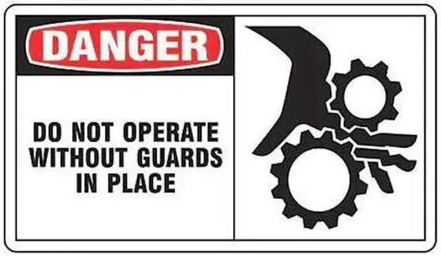 Safety Label, Horizontal Rectangle, Number of Printed Sides 1, English, Sign Format Traditional OSHA, Sign Legend Do Not Operate Without Guards In Place, Sign Legend Background Color White, Sign Legend Style Symbol and Text, Package Quantity 5
