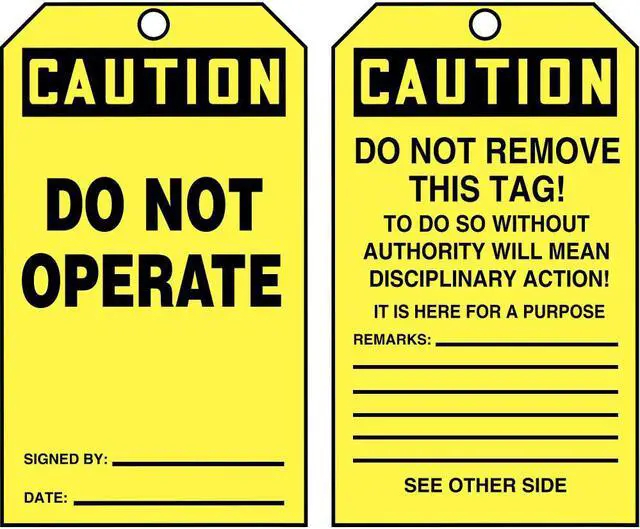 Caution Tag By The Roll, Subject Matter General Safety, Sign Legend Do Not Operate, Legend Same on Both Sides No, Sign Header Caution, Sign Header Background Color Black, Tag Style Single Part, Shape Rectangular, Safety Tag Legend - Back Side Do Not Remove This Tag!, Sign Header -Back Side Caution, Package Quantity 250. This item has been restricted from sale in the following state (s): []