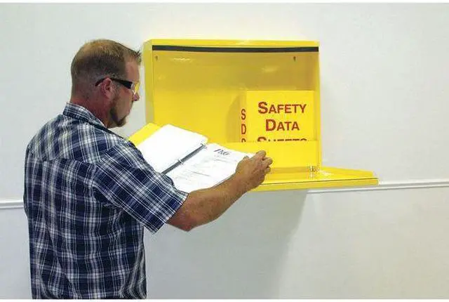 Information Center, Binder Holder Material Steel, Binder Material Plastic, Binder Ring Size 2 1/2 in, Clipboard Material Not Applicable, Document Storage Component Color Yellow, Hazard Communication Standard OSHA, Included Hardware (2) 2 1/2 in Binders, (2) 36 in Metal Security Chains, Cabinet, Included Supplemental Materials (1) 17 in x 22 in Poster, Language English, Mounting Hardware Included No, Mounting Style Cabinet, Number of Binder Holders 1, Number of Binders Included 2. This item has been restricted from sale in the following state (s): []