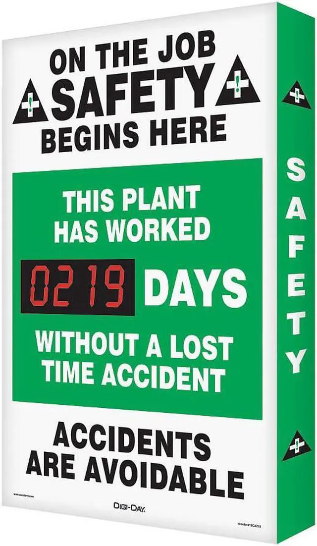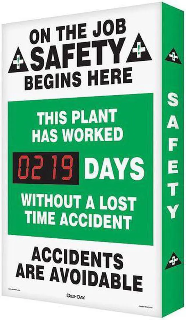 California Proposition 65: This product contains a chemical known to the State of California to cause birth defects or other reproductive harm. Electronic Safety Scoreboard, Sign Legend On The Job Safety Begins Here This Plant Has Worked ___ Days Without A Lost Time Accident Accidents Are Avoidable, English, Height 28 in, Width 20 in, Vertical Rectangle, Background Color White, Number of Displays 1, Display Format Number of Days. This item has been restricted from sale in the following state (s): []