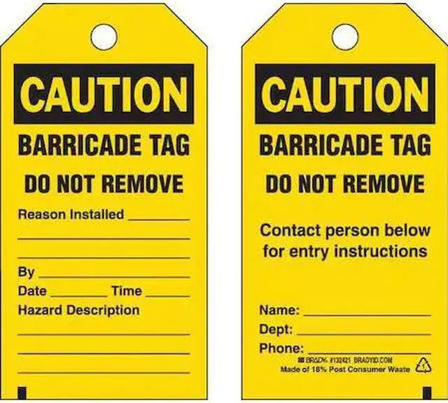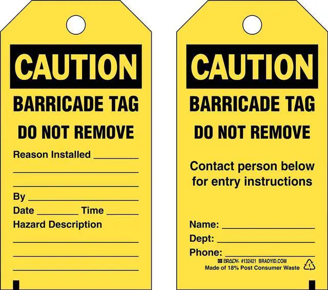 Description:, Legend Same on Both Sides Yes, Sign Header Caution, Shape Rectangular, Safety Tag Legend - Back Side Barricade Tag Do Not Remove Contact Person Below For Entry Instructions, Sign Header -Back Side Caution, Package Quantity 25. This item has been restricted from sale in the following state (s): []